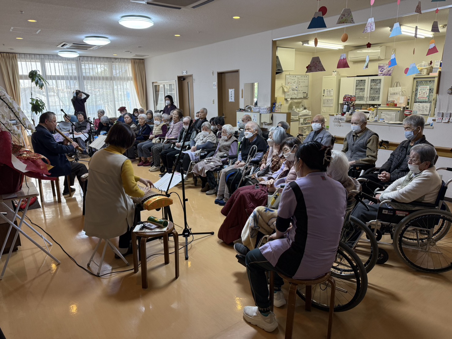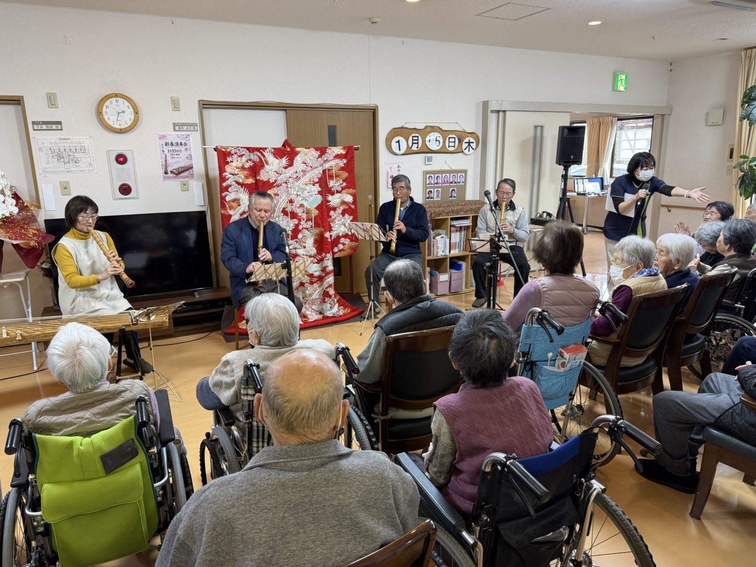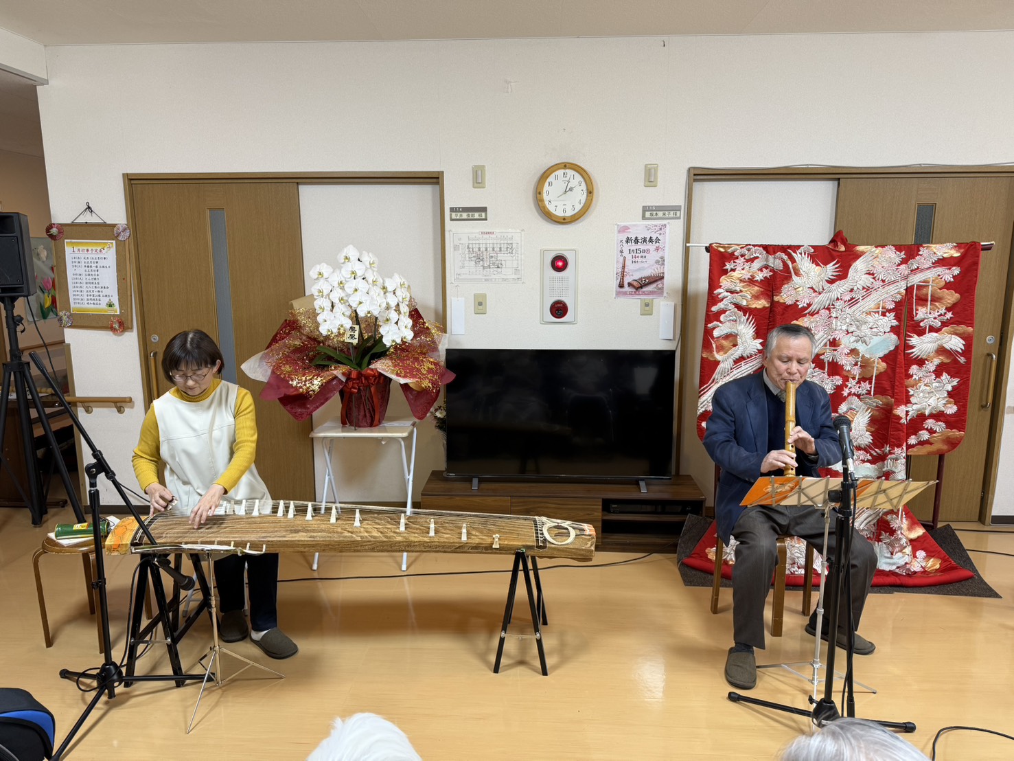 尺八と琴の演奏会 2026.01.23ブログ HOME ブログ ブログ 尺八と琴の演奏会 1月15日㈭ 新春にふさわしい尺八と琴の演奏会があり、入居者の皆様は日本の伝統楽器の音色に耳を傾けておられました。 ブログ